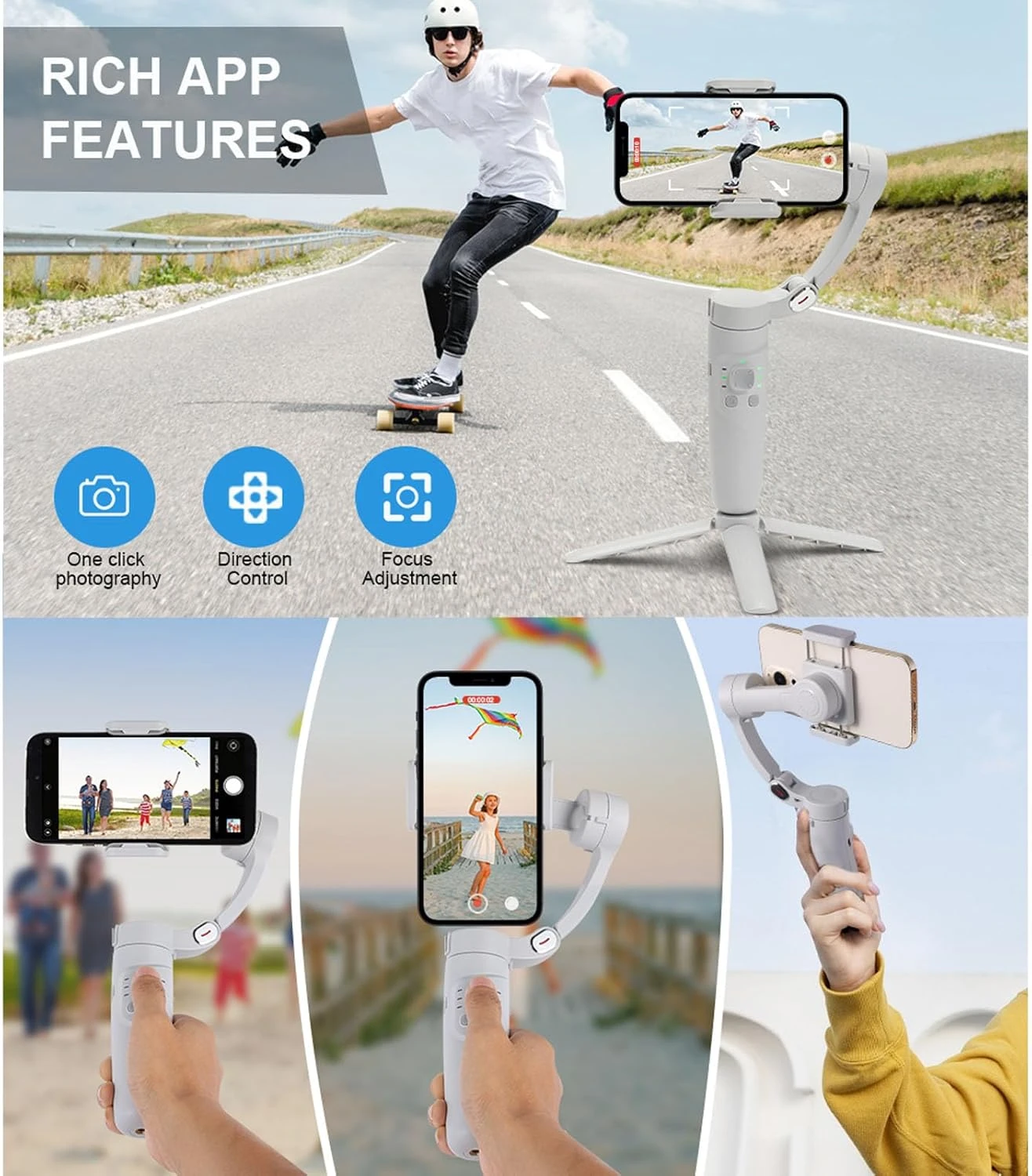 Stabilisateur de cardan pliable pour smartphones : EqiEch Merak M1 est un stabilisateur portatif spécialement conçu pour les téléphones mobiles, qui permet aux téléphones mobiles de prendre des photos stables et fluides. Lorsque vous utilisez ce téléphone mobile Q8pro PTZ, vous pouvez profiter d'un selfie parfait, d'une vidéo ultra fluide, d'un suivi automatique et d'autres fonctions qui peuvent mieux vous aider à enregistrer toutes les belles choses de votre vie dans votre vie quotidienne. Stabilisateur de cardan anti-secousse à 3 axes : avec un gyroscope sportif puissant, un contrôle moteur de haute précision, une stabilisation anti-secousse unique et une technologie d'équilibrage automatique, assurez-vous que le téléphone reste stable et résolvez le problème des tremblements de la main pendant le tournage, améliorez la vidéo. effet de prise de vue du téléphone mobile. Convient pour regarder des vidéos, faire un chat vidéo, filmer des vidéos, prendre des selfies ou des photos de groupe. Batterie de grande capacité avec longue durée de veille : la batterie au lithium de grande capacité de 2 200 mAh peut fournir jusqu'à 5 heures d'autonomie pour la fonction de stabilité. Même si vous passez une journée entière à filmer, vous n’avez pas à vous soucier du manque de batterie du cardan portable. Le package est livré avec un câble de chargement USB Type-C, qui vous permet de charger rapidement à tout moment et en tout lieu.